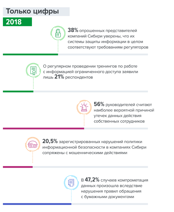 Аналитический центр компании InfoWatch представляет исследование отдельных аспектов обеспечения безопасности корпоративной информации в коммерческих организациях Сибирского федерального округа (СФО). Исследование основано на результатах опроса, проведенного в конце 2018 года среди сотрудников, руководителей направления информационной безопасности, высшего руководства хозяйственных обществ данного макрорегиона России. В материале представлены сопоставленные сведения, полученные от респондентов с фактической картиной инцидентов в регионе.