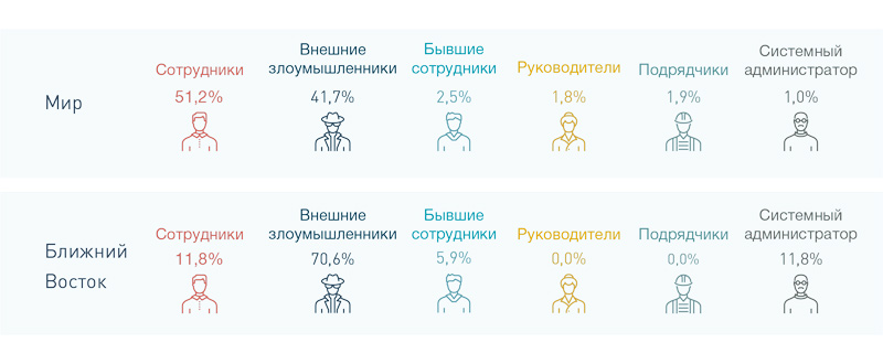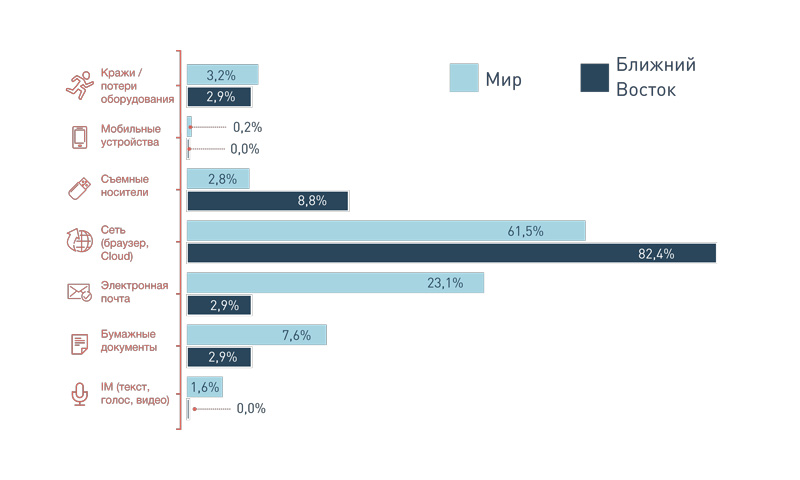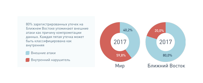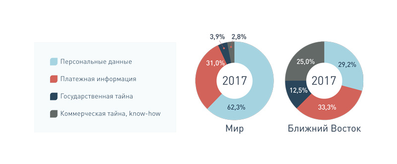 Доля утечек персональных данных и платежной информации на Ближнем Востоке меньше, чем в мире. Тем не менее, она скоро вырастет из-за массовой цифровой трансформации экономики и увеличения интереса нарушителей к таким типам данных из-за их высокой ценности.