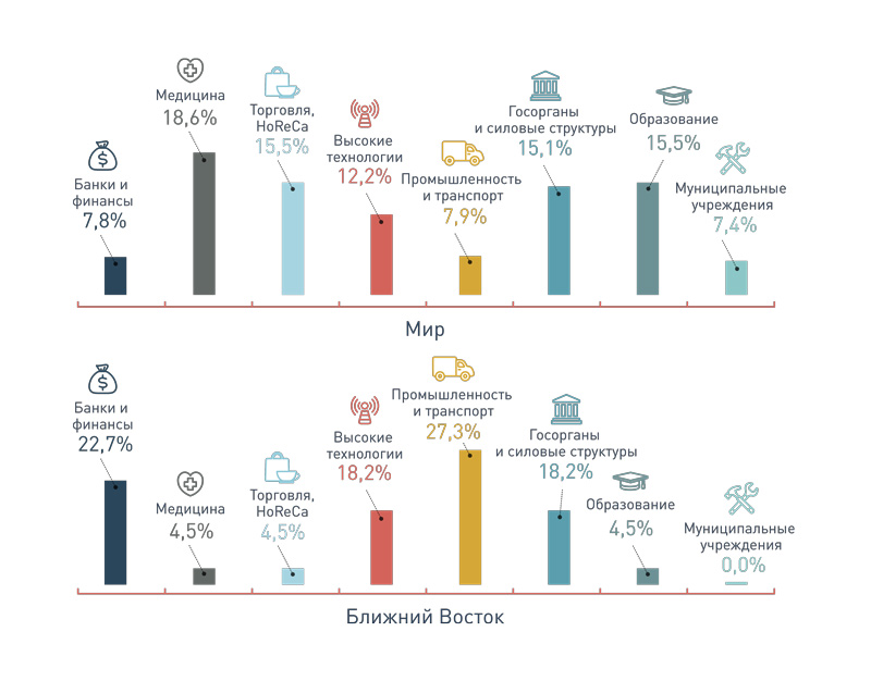 Наибольший интерес для нарушителей представляют организации в сферах финансов, промышленности, а также IT-компании и органы государственного управления.