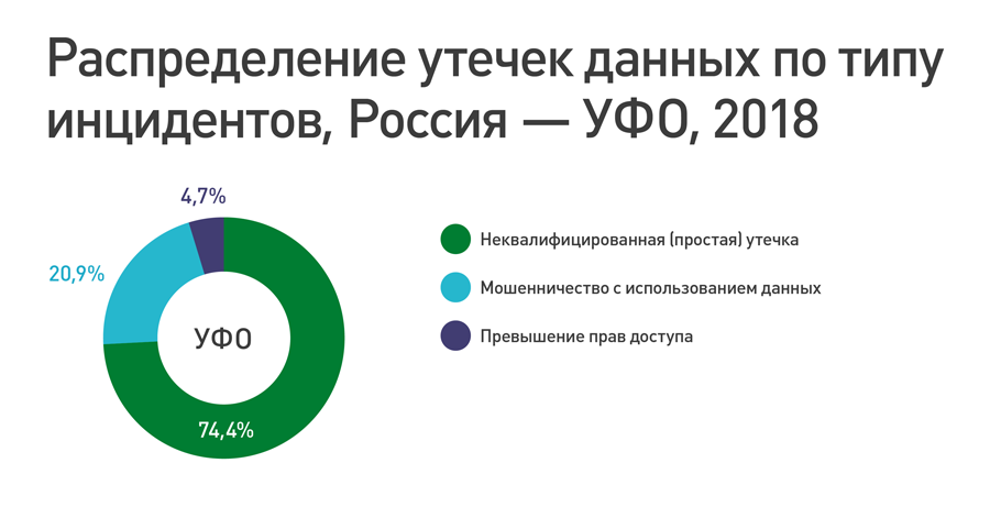 Как и в целом в России, в 90% случаев утечек данных в УФО причиной инцидента стали действия внутреннего злоумышленника в организации, или инсайдера.