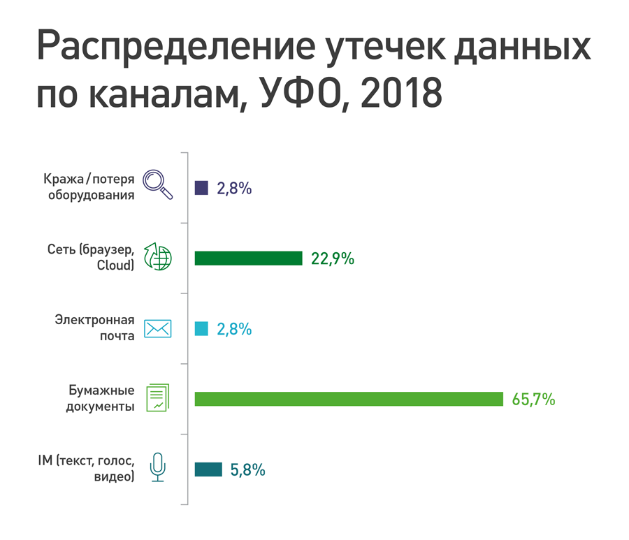 В большинстве случаев утечки данных и в России, и в Уральском федеральном округе в частности, происходят по двум каналам передачи информации: через сеть и потерю бумажных документов. При этом, доля инцидентов, связанных с потерей корпоративных данных на бумажных носителях на 20% превышает долю в общероссийском распределении, а доля утечек через интернет и облачные носители, наоборот, на 20% ниже, чем в среднем по стране.