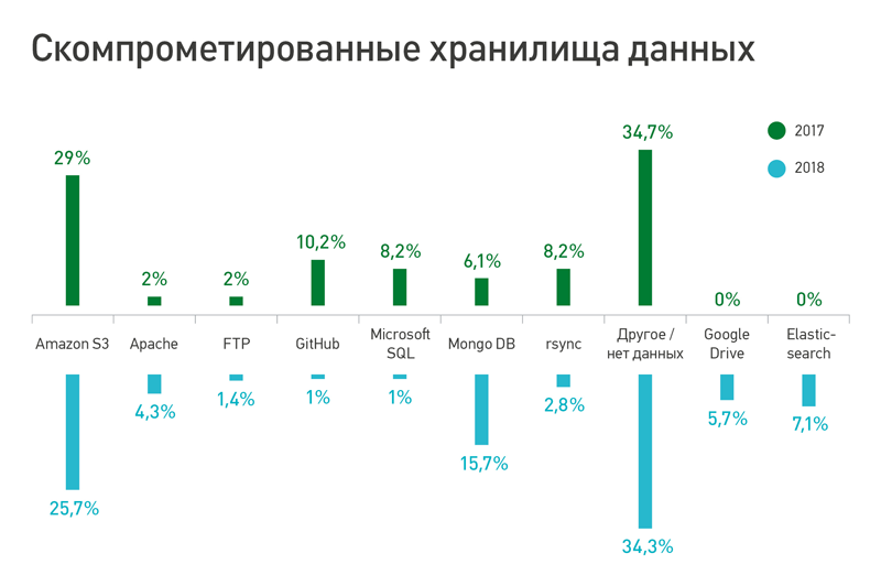 Более четверти всех известных случаев утечек данных из облаков в 2018 году пришлось на объектные хранилища Amazon S3. В прошлом году резко возросло число утечек с серверов Mongo DB — с 6% в 2017 году до 15,7% инцидентов. Кроме того, отмечено большое число случаев компрометации данных, хранящихся на платформах Elasticsearch и Apache, а также при использовании файлового хостинга Google Drive. Доля утечек в процессе резервного копирования (rsync) сократилась примерно втрое, а при работе с репозиториями GitHub – в семь раз.