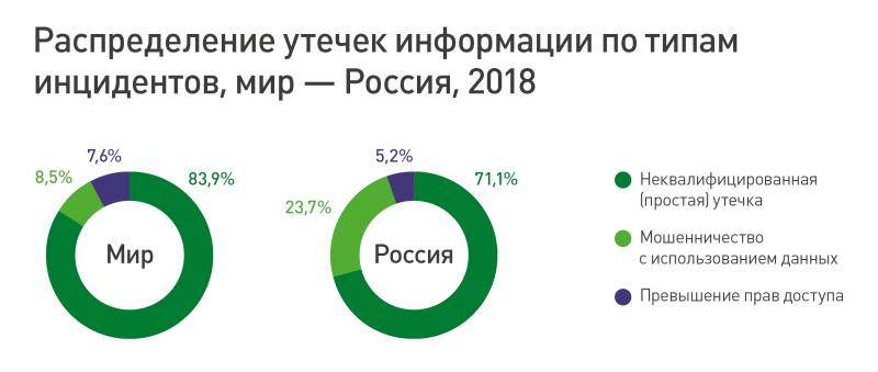 По данным аналитического центра InfoWatch, в 2018 г. доля утечек конфиденциальной информации, сопряженных с мошенническими действиями в отношении данных, во всей совокупности зарегистрированных утечек составила 8,5%. В российском распределении доля мошеннических инцидентов оказалась почти в три раза выше — 23,7%