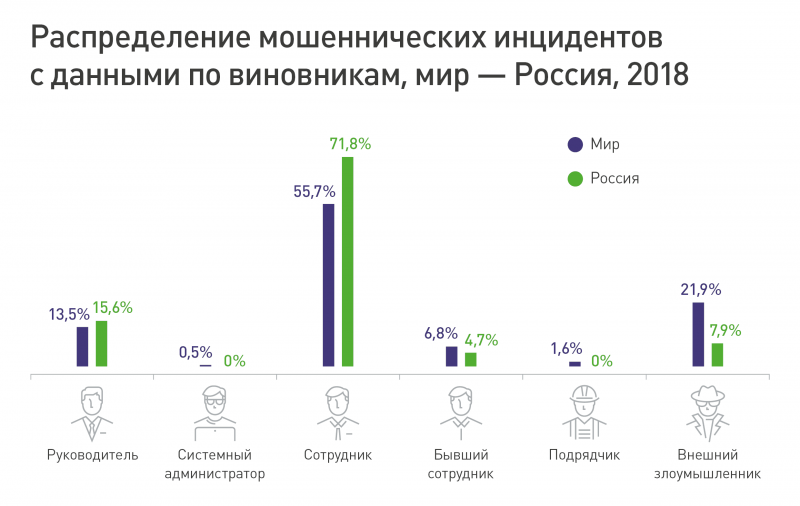В глобальном масштабе существенную долю занимают мошеннические инциденты, спровоцированные действиями внешних злоумышленников. Соответственно, в мире меньше, чем в России, процент подобных инцидентов, случившихся по вине рядовых сотрудников.