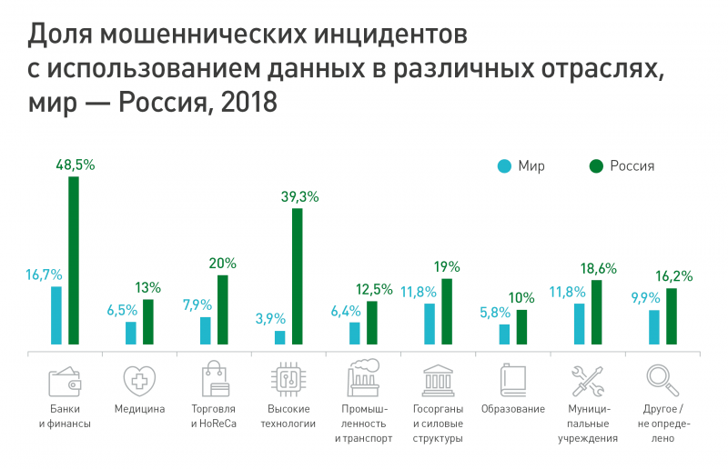 Что касается процента мошеннических инцидентов с данными в различных вертикалях, то в мировом распределении наибольшая доля мошенничества оказалась в банковском секторе. Следом идут государственные и муниципальные организации. В России во многих отраслях доля фрода на основе конфиденциальной информации в несколько раз выше, чем в мировом распределении. А в высокотехнологичном сегменте она выше на порядок. Злоумышленники чаще всего используют данные в мошеннических целях в тех организациях, откуда эти данные быстрее всего «конвертировать» в деньги, и там, где легче обойти системы защиты (или воспользоваться их отсутствием).