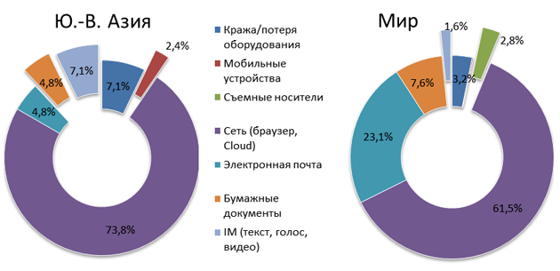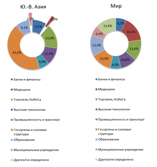 В странах ЮВА, Южной Корее, Индии и Бангладеш доля утечек данных, жертвами которых стали государственные органы и силовые ведомства, составила 43%, в то время как в мире этот показатель не превышал 13%. На долю утечек конфиденциальной информации из медицинских учреждений в исследуемом регионе пришлось около 2% случаев, тогда как на общемировой выборке их доля составляла более 16%.