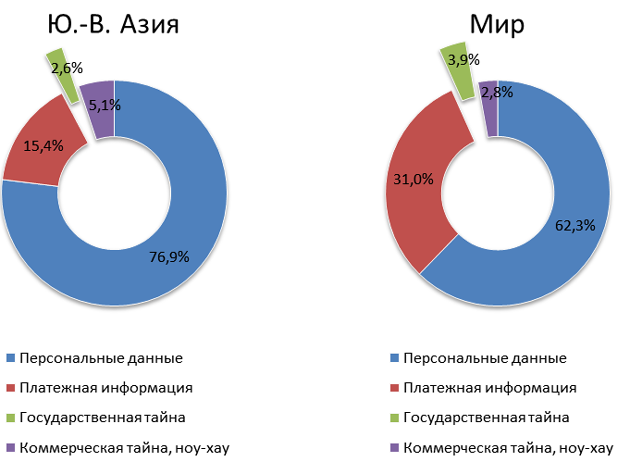 Как и на глобальной выборке, более 90% случаев утечек информации в странах Юго-Восточной Азии, Южной Корее, Индии и Бангладеш сопровождались компрометацией «чувствительных данных». В исследуемом регионе в 77% инцидентов страдали персональные данные, еще 15% случаев пришлось на компрометацию платежной информации. В мире платежные данные страдали чуть чаще – примерно в каждом третьем случае утечки.