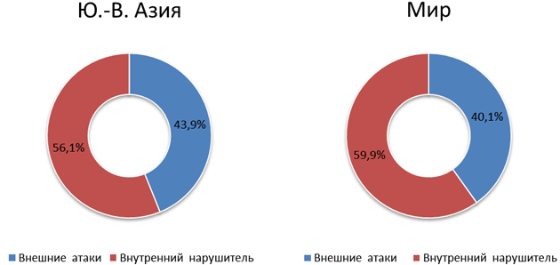 Как и во всем мире, большая часть скомпрометированных в исследуемом регионе данных пришлась на «внутренних» нарушителей. Виновниками 56% утечек данных из организаций в странах ЮВА, Южной Кореи, Индии и Бангладеш стали сотрудники, руководители и подрядчики, которые имели легитимный доступ к конфиденциальной информации, стали причиной. В сравнении с общемировыми тенденциями исследуемый регион отличается распределением утечек по пострадавшим отраслям и типам скомпрометированных данных.