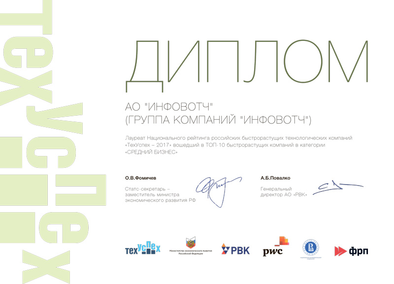 Группа компаний (ГК) InfoWatch стала победителем шестого ежегодного национального рейтинга российских высокотехнологичных быстроразвивающиеся компаний «ТехУспех-2017» и вошла в топ-5 компаний в категории «Средний бизнес», топ-10 инновационных компаний в категории «Средний бизнес» и топ-10 компаний, обладающих высоким экспортным потенциалом в категории «Средний бизнес».