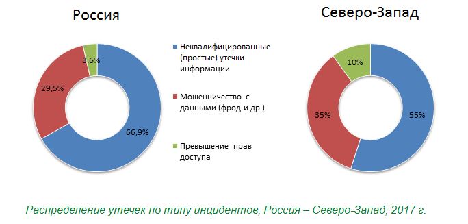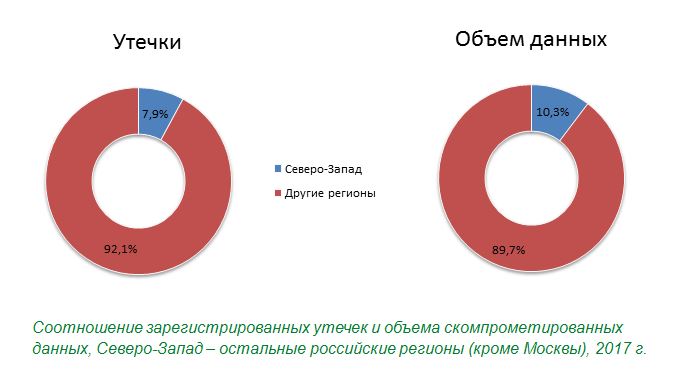 В распределении инцидентов по регионам, исключая Москву, доля СЗФО составила почти 8%, а по объёму скомпрометированной информации превысила 10%, что ниже среднего показателя по России. Тем не менее, в Северо-Западном федеральном округе в 2017 году зарегистрирован один из самых высоких в России по сравнению с 2016 годом показателей роста утечек конфиденциальной информации, который составил 25%. Кроме того, в рассматриваемом макрорегионе доля квалифицированных утечек составляет почти половину от общего числа случаев, что существенно выше, чем в целом по России.