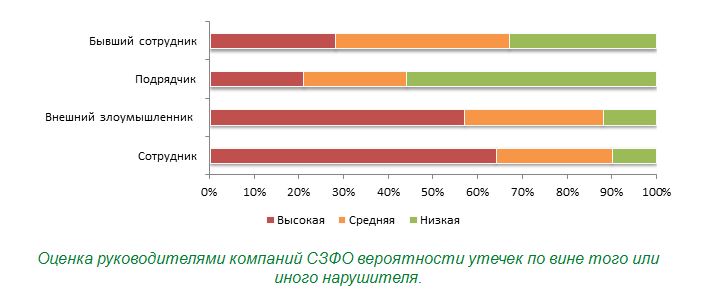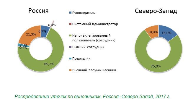 Результаты этого опроса подтверждает статистика происшествий. В 2017 году на предприятиях Северо-Западного федерального округа 90% утечек произошли по вине внутренних нарушителей — рядовых сотрудников и топ-менеджеров. Этот показатель в СЗФО почти на 15% выше, чем в среднем по стране.