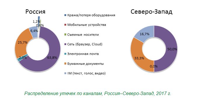 В СЗФО, как и по России в целом, высока вероятность утечки по сетевому каналу. Несмотря на развитие электронного документооборота, треть информации по-прежнему передается нелегально на бумажных носителях. Доля утечек данных через канал мгновенных сообщений в исследуемом регионе существенно выше, чем в общероссийском распределении.