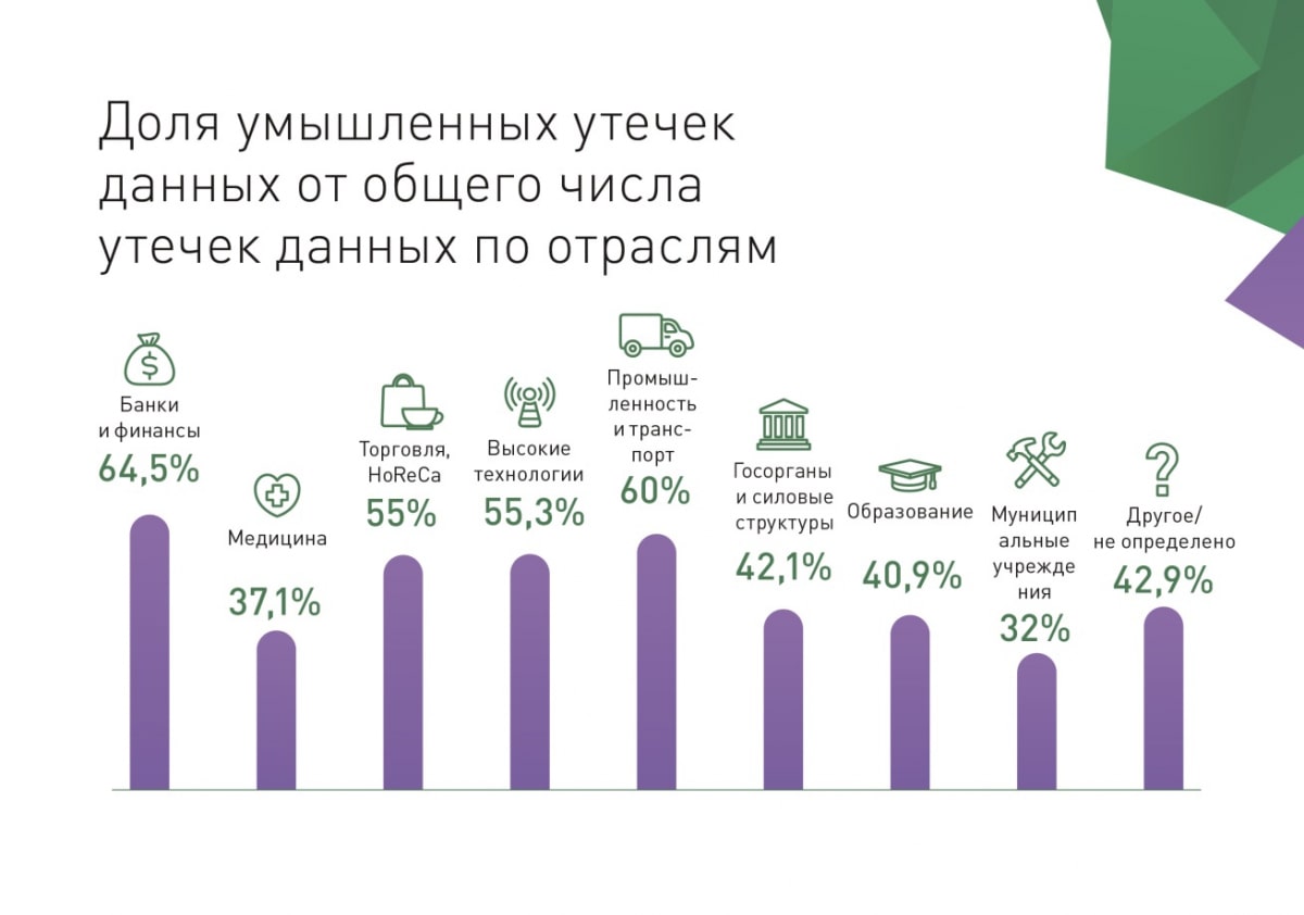 В целом ряде отраслей, таких как банковский сектор и промышленность, 60% и более утечек персональных данных носили умышленный характер.