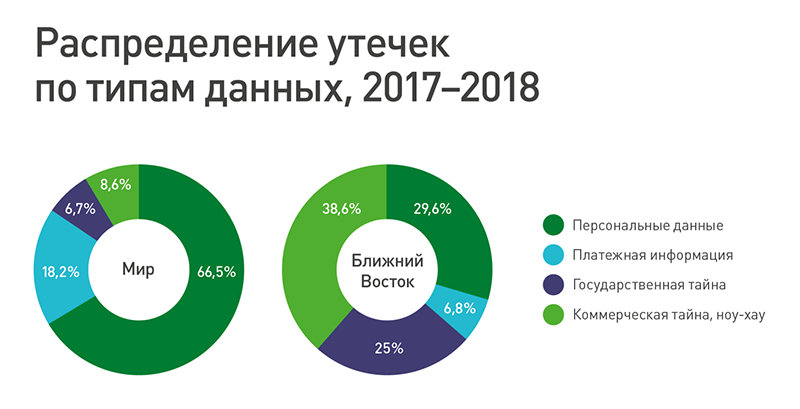 Наибольшая доля инцидентов в странах Ближнего Востока, более 38%, связана с компрометацией данных из категории коммерческой тайны и ноу-хау, в то время как в мире основным типом скомпрометированной информации за исследуемый период стали персональные данные, на долю которых пришлось 66% от общего числа утечек. На Ближнем Востоке утечки персональных данных составили менее 30% всех инцидентов.