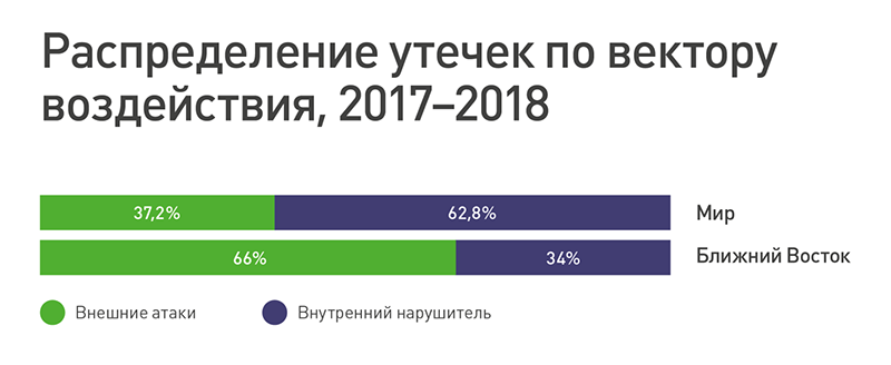 В компаниях Ближнего Востока две трети от совокупного числа утечек произошли в результате внешних атак, в то время как в мире почти та же доля — 63% инцидентов — пришлась на внутренние нарушения в организациях.