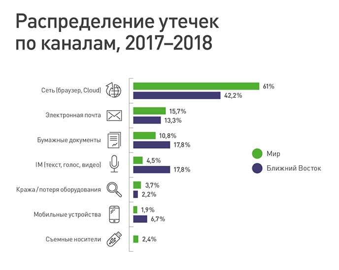 Основным каналом утечек из организаций на Ближнем Востоке, как и в мире, за исследуемый период был сетевой канал. Однако распределение утечек по каналам на Ближнем Востоке и в целом по миру имеет серьезные различия. Доля утечек через мобильные устройства на Ближнем Востоке более чем в три раза выше, чем в мире, а доля инцидентов посредством мгновенных сообщений (IM) в регионе почти в четыре раза превышает аналогичный общемировой показатель.