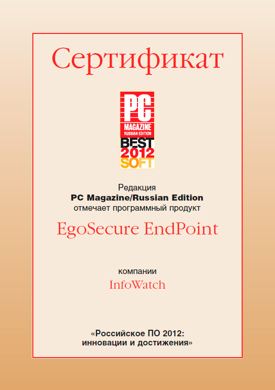 Продукт EgoSecure Endpoint компании InfoWatch отмечен дипломом журнала PC Magazine в номинации «Российское ПО 2012: инновации и достижения».