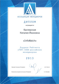 Наталья Касперская, генеральный директор ГК InfoWatch заняла 1-е место в рейтинге TOP-1000 высших российских руководителей 2013 года в категории «Информационные технологии». В первую десятку также вошли директор Фирмы 1С Борис Нуралиев, вице-президент, глава представительства Oracle в России и СНГ Валерий Лановенко, президент «Майкрософт Рус» Николай Прянишников и другие известные российские топ-менеджеры в области ИТ.