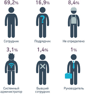 В отчете впервые приводится классификация инцидентов по характеру действий нарушителя. К непосредственным утечкам данных относятся 83% случаев компрометации информации, 11% зафиксированных утечек были сопряжены с использованием сотрудниками служебного положения для получения личной выгоды, в 5% утечек произошли вследствие превышения сотрудниками прав доступа к информации.