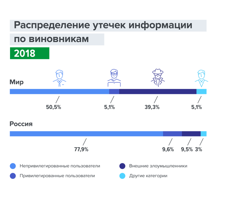 Причины такого разрыва аналитики связывают с несколькими факторами. В первую очередь, речь идет о распределении публичных инцидентов — в России уже традиционно доля утечек по вине внутренних нарушителей намного выше, чем в мире.