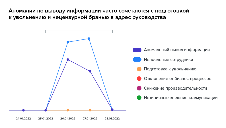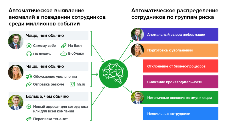 По-настоящему эффективная предиктивная аналитика обязана отвечать трем основополагающим требованиям. Первое — предиктивная аналитика должна использовать все необходимые данные, которые ранее накопила DLP-система (InfoWatch Traffic Monitor). Второе — предиктивная аналитика должна уметь отличать аномальное поведение сотрудников от нормального среднего поведения. Задача предиктивной аналитики делать это в динамике, учитывать поведение сотрудников в прошлом и настоящем, уметь сопоставлять поведение сотрудника с действиями его коллег. Третье — предиктивная аналитика должна уметь «взвешивать» полученные результаты. Задача предиктивной аналитики — приоритезировать события DLP и указывать специалисту информационной безопасности на риски. Выявлять и «подсвечивать» среди всех рисков самые серьезные — это задача предиктивной аналитики высшего уровня.