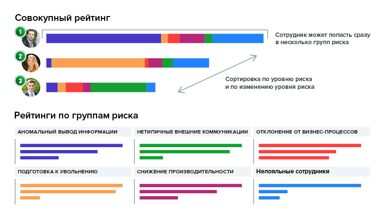 Рейтинг поведения сотрудников — это конкретный конечный результат. Рейтинг поведения сотрудников позволяет обратить внимание на самых подозрительных коллег и проверить связанные с ними события. Рейтинг поведения сотрудников нужен как по каждой группе риска в отдельности, так и консолидированный. Так специалисту ИБ предоставляется возможность заметить корреляции аномалий с сотрудниками с других позиций рейтинга поведения сотрудников и из других групп риска.