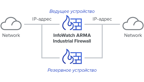 В режиме отказоустойчивого кластера несколько InfoWatch ARMA Industrial Firewall объединяются в единый кластер в режиме active‑passive. В каждый момент времени только одно устройство в кластере (ведущее) обрабатывает весь трафик. Подчинённые (резервные) устройства постоянно синхронизируют своё состояние и конфигурацию с ведущим (мастер‑устройством). Если ведущее устройство отключить, то резервное возьмёт функцию обрабатывания трафика до момента, пока мастер-устройство не вернётся в рабочее состояние.