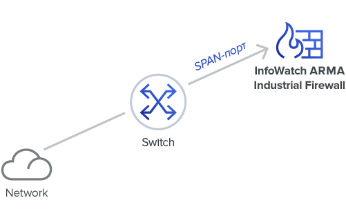 В режиме sniffing mode (мониторинга) InfoWatch ARMA Industrial Firewall работает в качестве системы обнаружения вторжений, которая анализирует копии сетевого трафика, снятого с зеркалированного порта. InfoWatch ARMA Industrial Firewall проводит глубокий анализ пакетов (DPI) и, в случае необходимости, уведомляет специалиста ИБ АСУ ТП о событиях информационной безопасности.