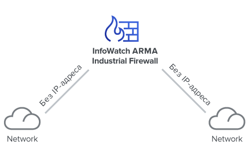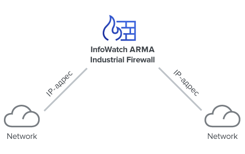 В режиме маршрутизации InfoWatch ARMA Industrial Firewall функционирует как межсетевой экран с функциями обнаружения и предотвращения вторжений, обеспечивая защиту передачи информации на уровне L3. Режим маршрутизации может использоваться при объединении подсетей, имеющих разное адресное пространство.
