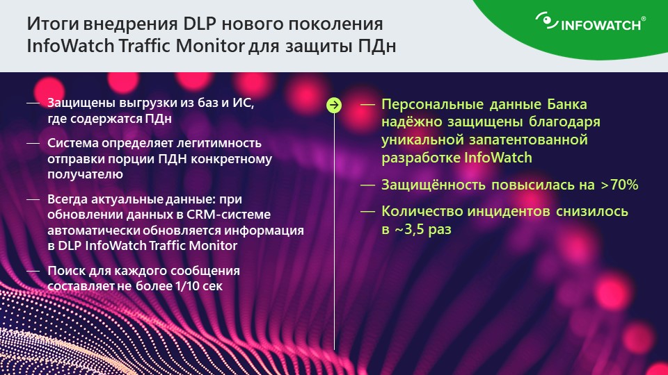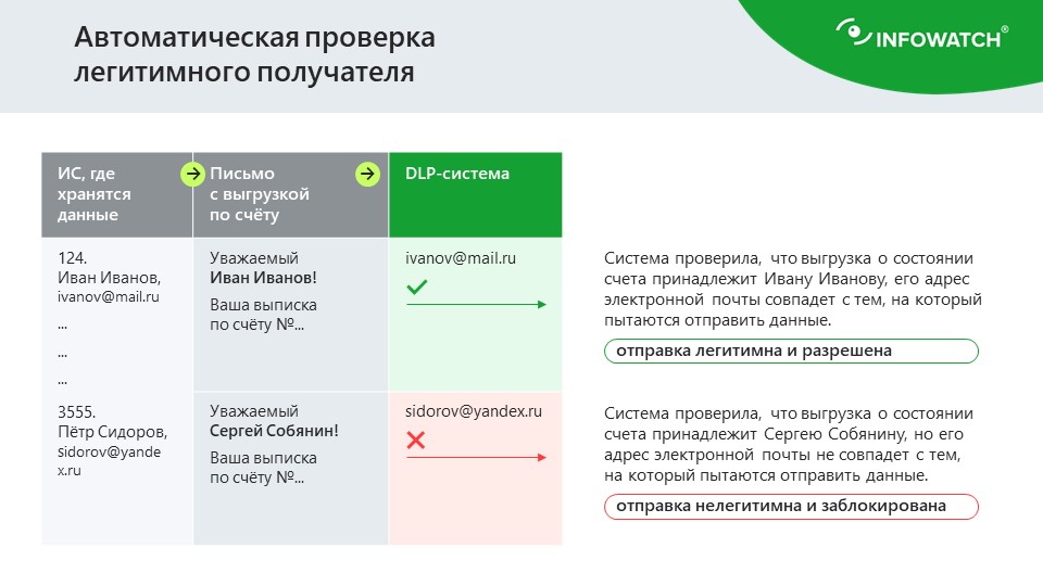 DLP InfoWatch Traffic Monitor синхронизируется с бизнес-системами банка, что позволяет оперировать только актуальными данными конкретных клиентов и проверять, указан ли в получателях письма их законный владелец.