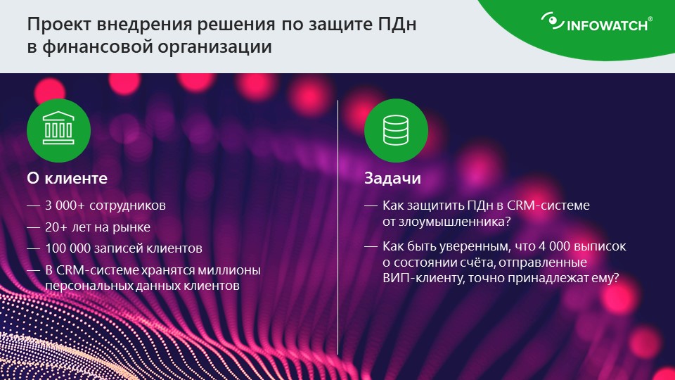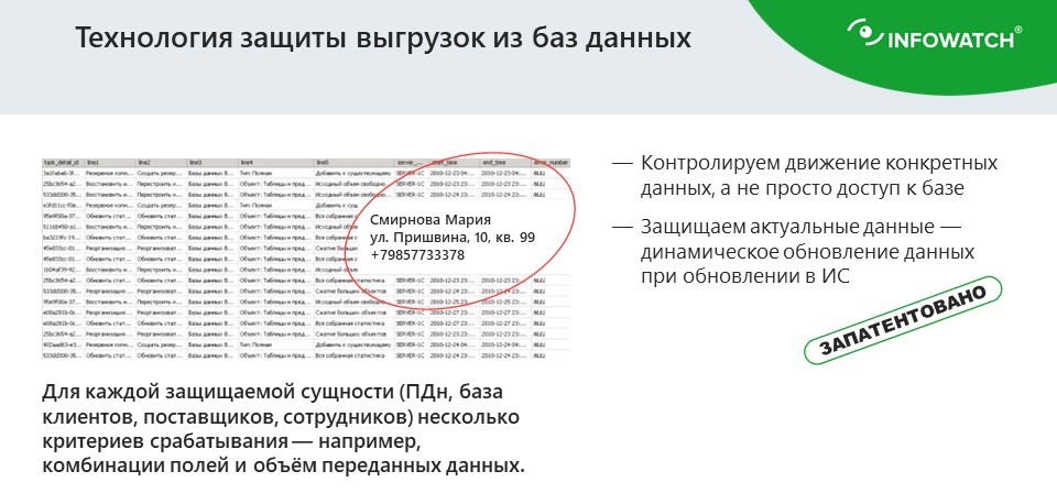 Для решения данных задач InfoWatch использует запатентованную технологию, которая позволяет определить конкретные персональные данные (далее — ПДн) конкретного клиента и проверить, является ли получатель их законным владельцем. Важным отличием этой технологии является то, что она основана на контекстном анализе, что позволяет идентифицировать, какие ПДн принадлежат конкретным клиентам банка.