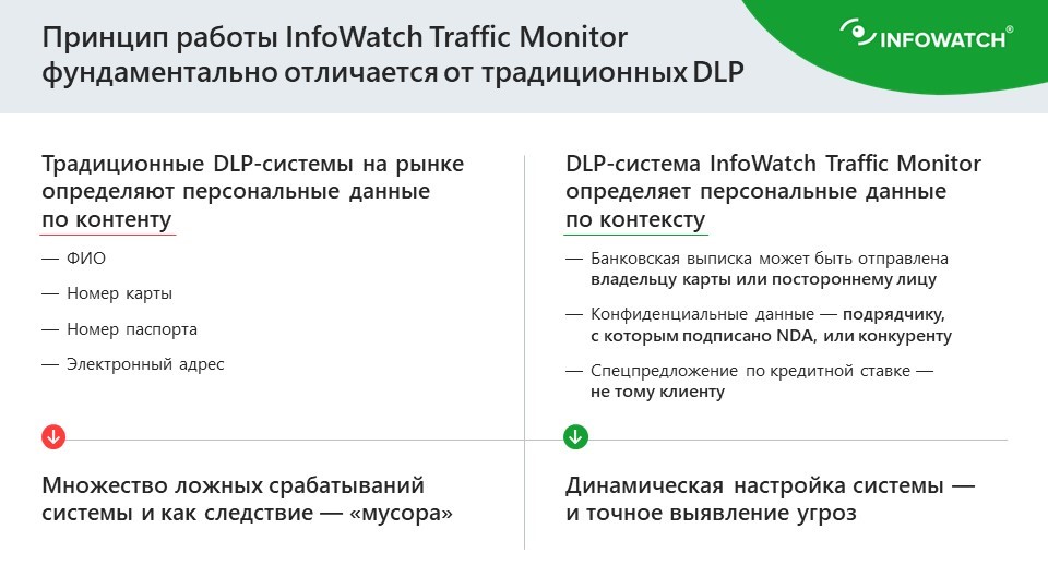 Суть технологии и инновационного подхода InfoWatch — защита, основанная на понимании DLP-системой контекста, а не только содержания.