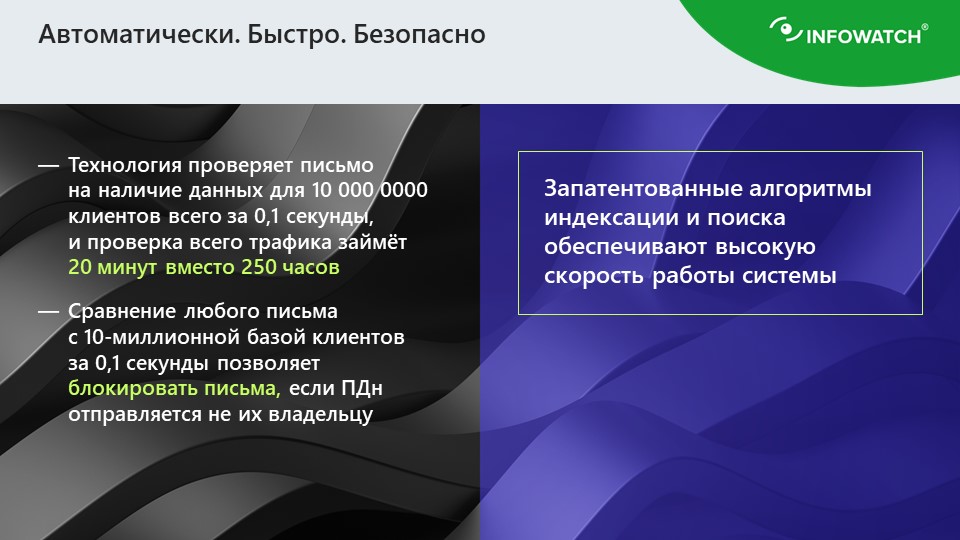 Решение InfoWatch позволяет проверять наличие ПДн для 10.000.000 клиентов всего за 0,1 секунды. Таким образом, проверка всего трафика займет всего 20 минут вместо 250 часов. Такие показатели достигаются благодаря запатентованным алгоритмам индексации и поиска, разработанным компанией InfoWatch.