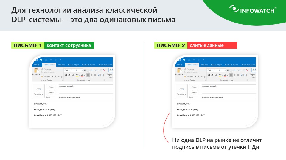 Начнем с базового сценария №1 — отправка письма за периметр компании. Для технологий контентного анализа классической DLP системы отправленное по электронной почте письмо с указанием ФИО и номером телефона — это два одинаковых письма: