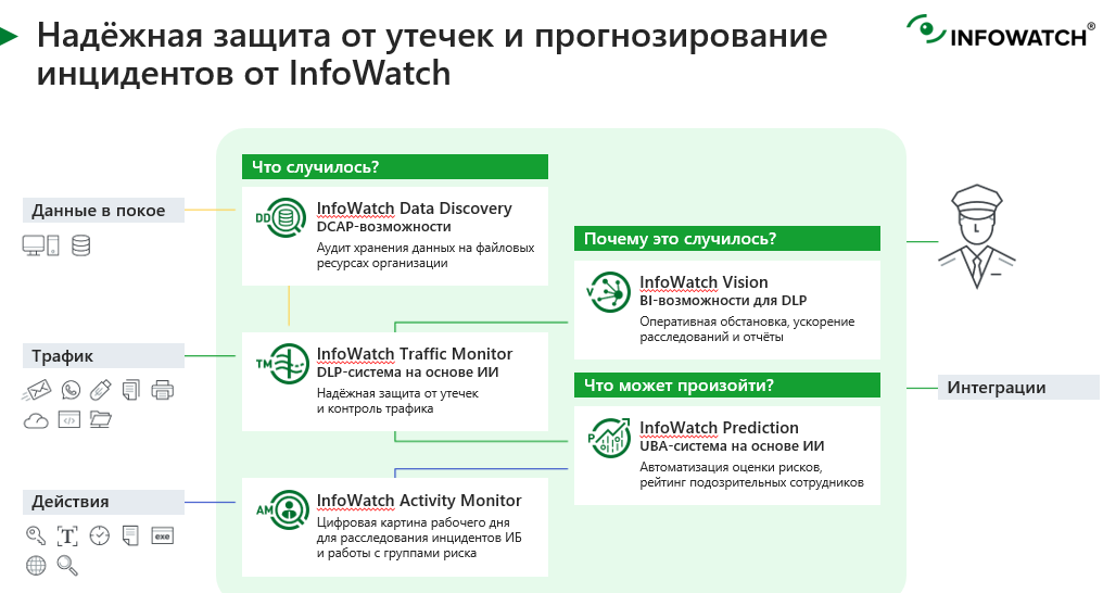- InfoWatch Activity Monitor — модуль, который обогащает данные DLP-системы данными о том, что делал сотрудник до, во время и после инцидента. Позволяет расследовать инциденты и собирать по ним доказательную базу.