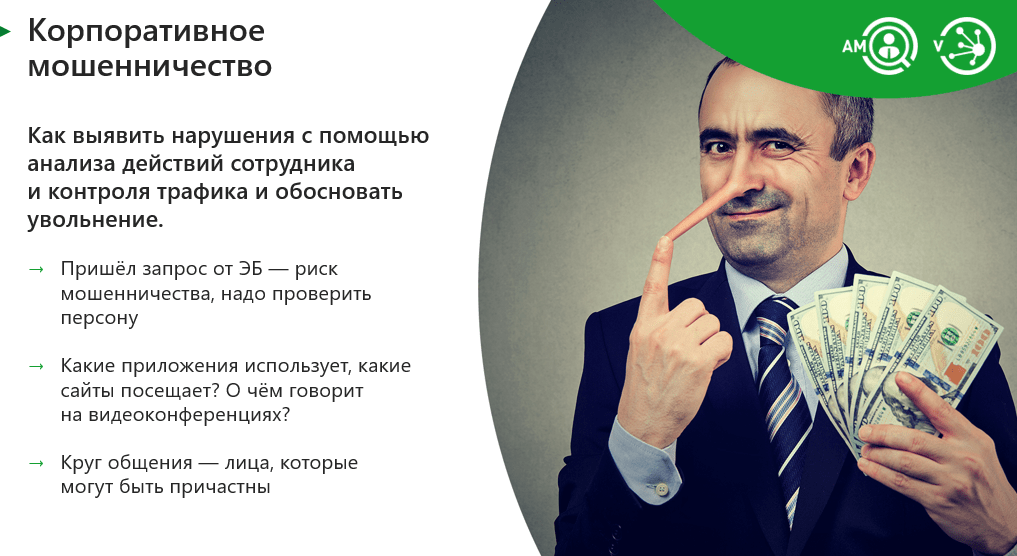 Выявление корпоративного мошенничества – веский повод для увольнения, как минимум. Выявление корпоративного мошенничества – дело службы ЭБ, но редко обходится без привлечения ИБ. Данные о действиях сотрудников и их коммуникациях содержат инсайты, которые позволят организовать системное выявление корпоративного мошенничества и его предотвращение.