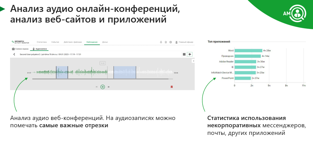 - Какие сайты посещает сотрудник, какие приложения использует, насколько это соответствует профилю его работы, о чем он говорит (тут пригодится возможность прослушать запись переговоров во время онлайн-конференций).