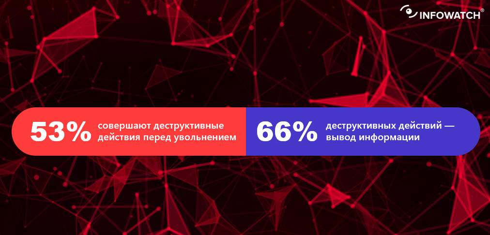 По данным ЭАЦ InfoWatch, более 50% сотрудников совершают деструктивные действия перед увольнением, причем 2/3 из них — это попытки вывода информации. А значит, этот этап должен являться является зоной повышенного внимания отдела ИБ.